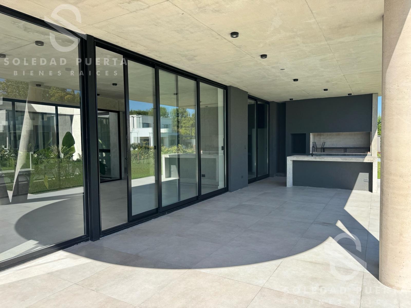 Gran galería con parrilla, con vista al jardín trasero y piscina. Entrada peatonal y cochera cubierta para dos vehículos y detalles premium.
