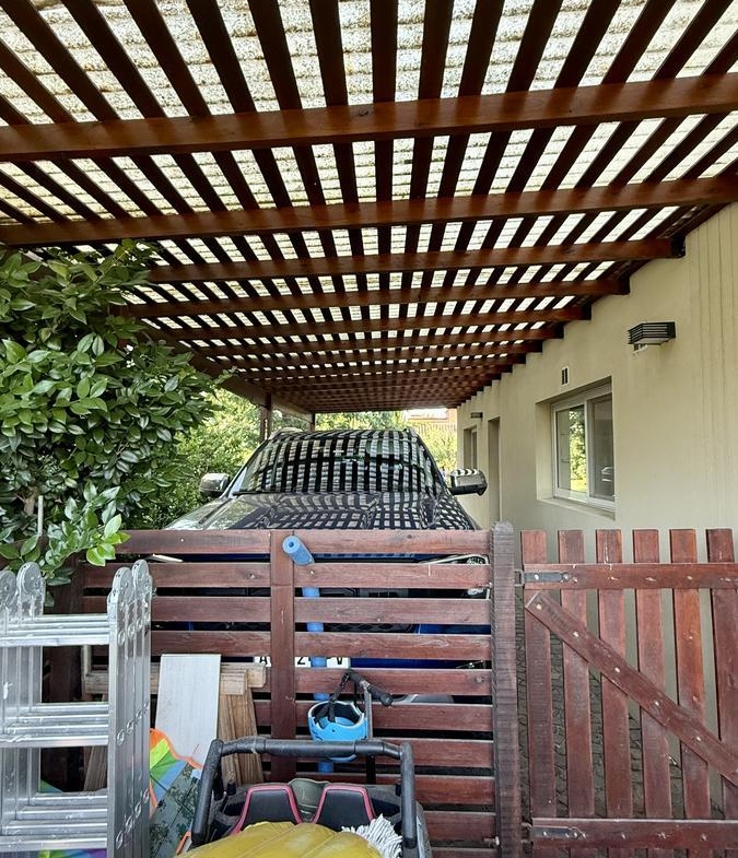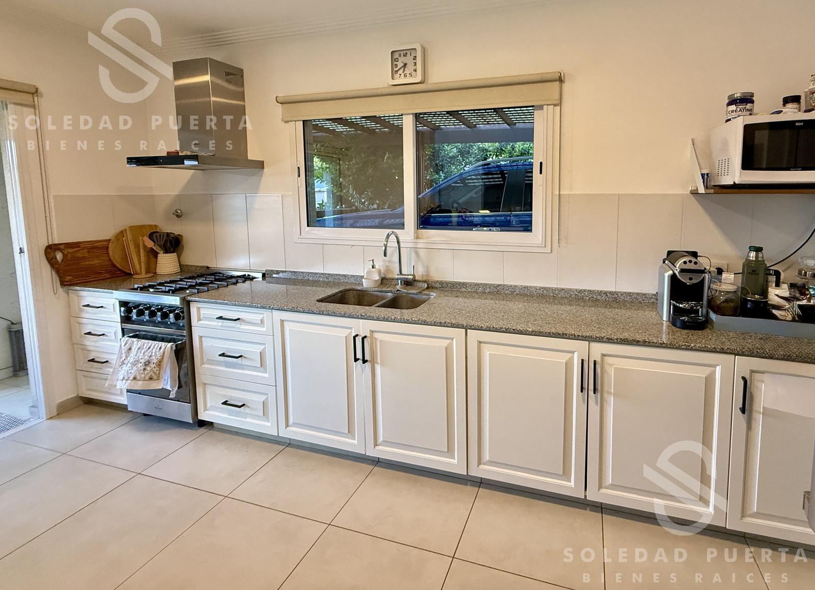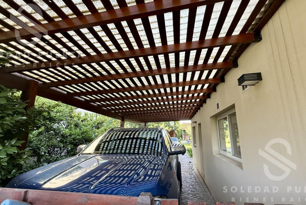 El exterior se destaca por su amplia galería, parrilla de acero, jardín parquizado con riego automático, grama bahiana, cerco vivo y pileta de 11 x 5 m. revestida en venecitas. Sector tender, cochera cubierta para dos autos y espacio para varios vehículos más.
