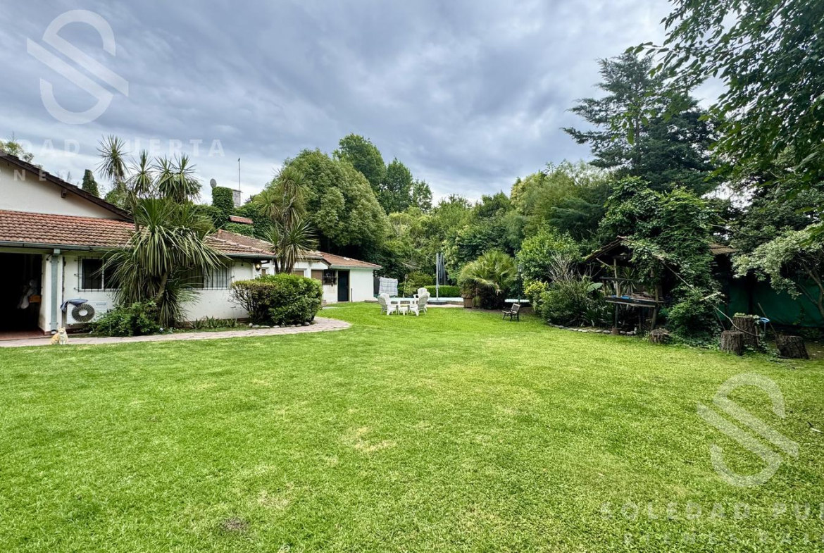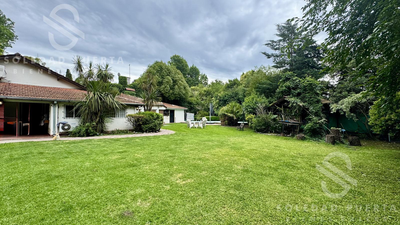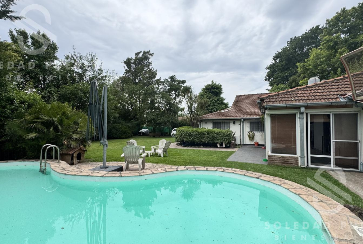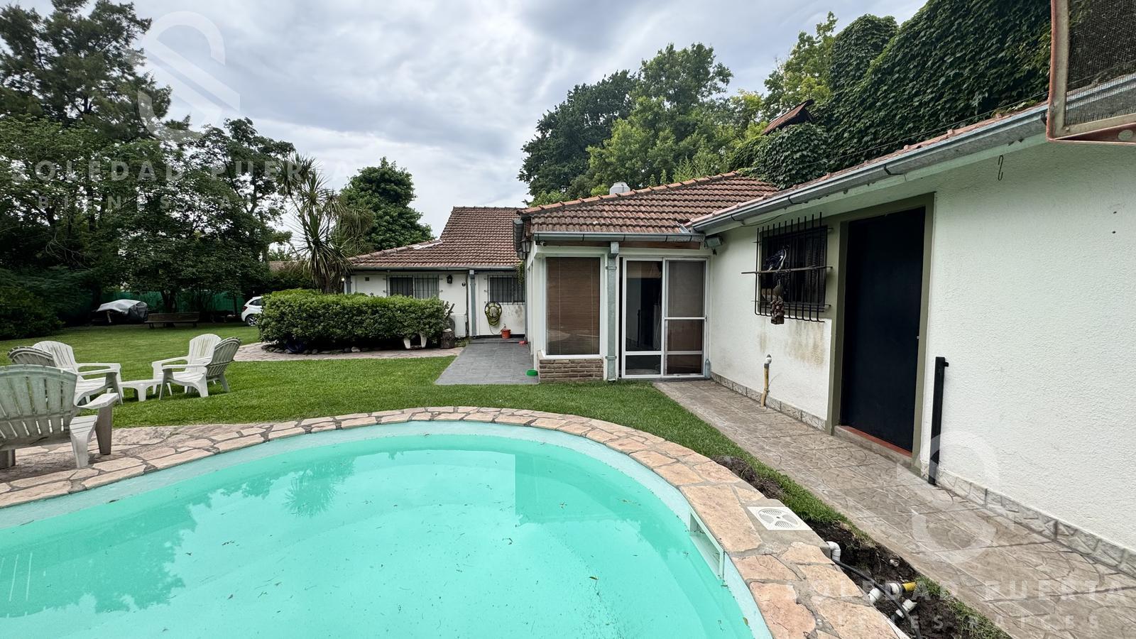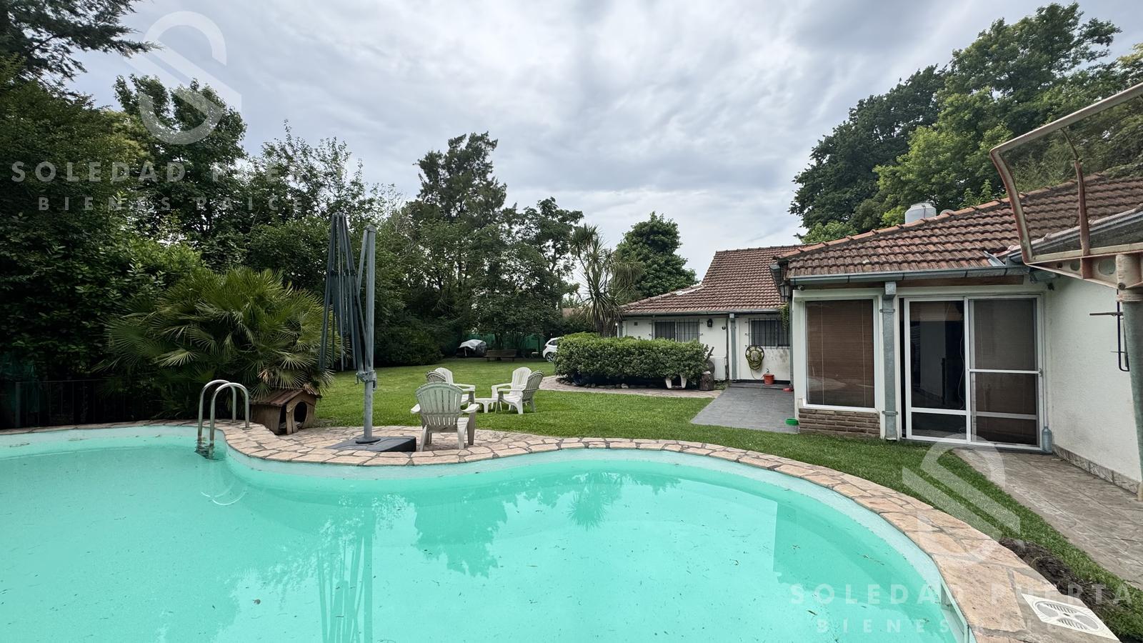Gran jardín con piscina, lavadero, galpón y cochera techada.
