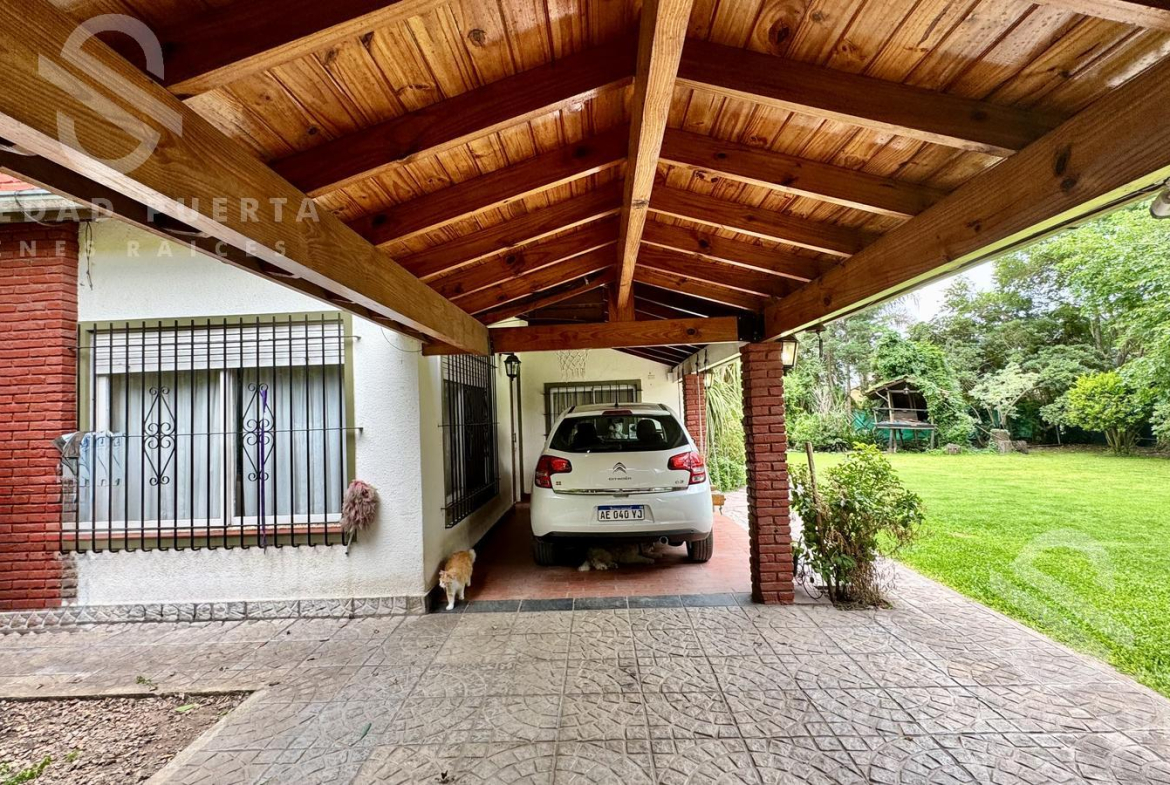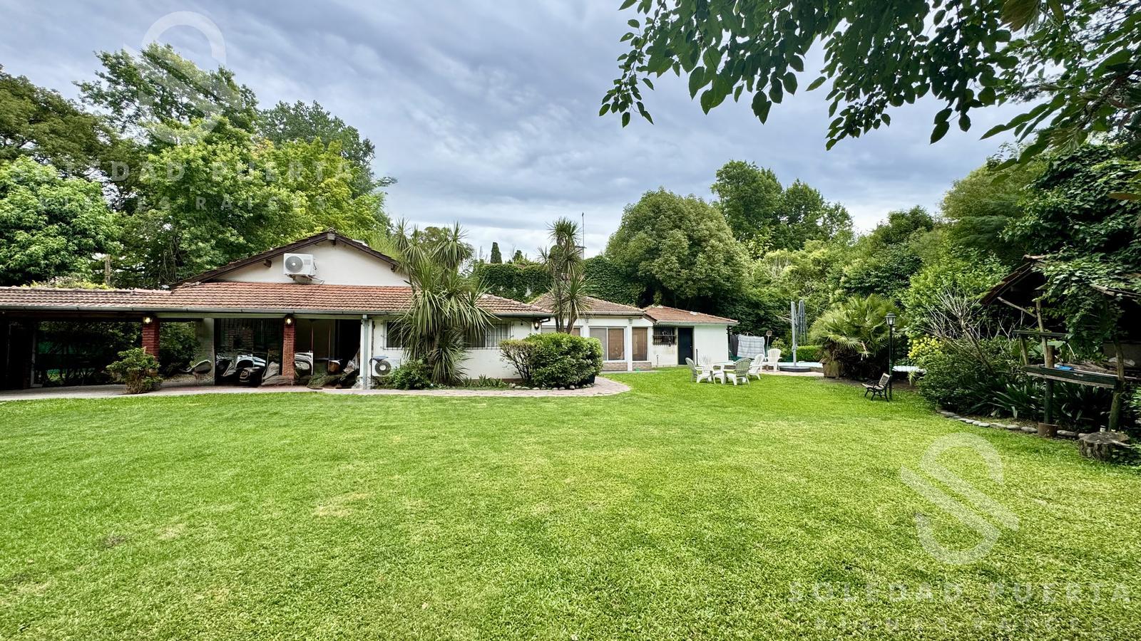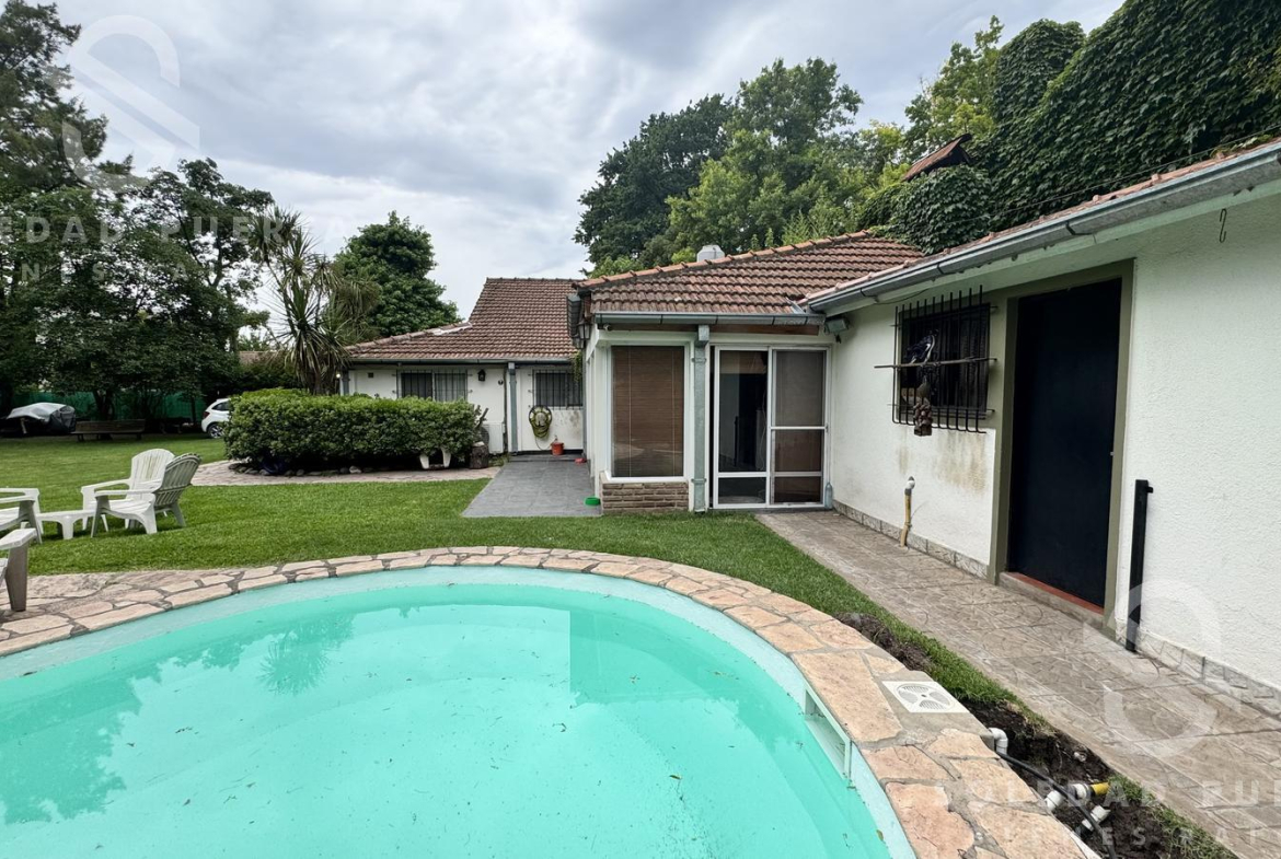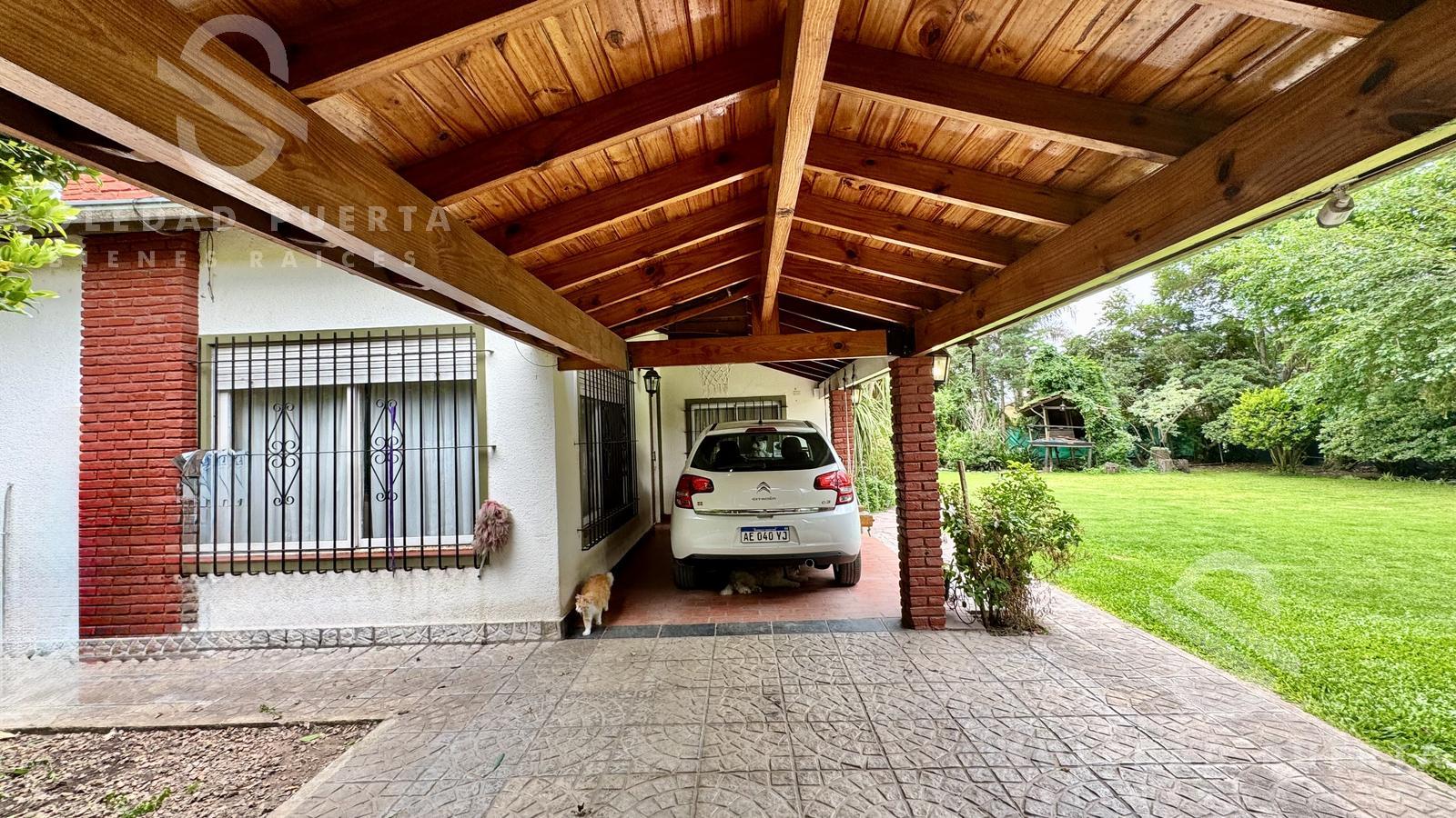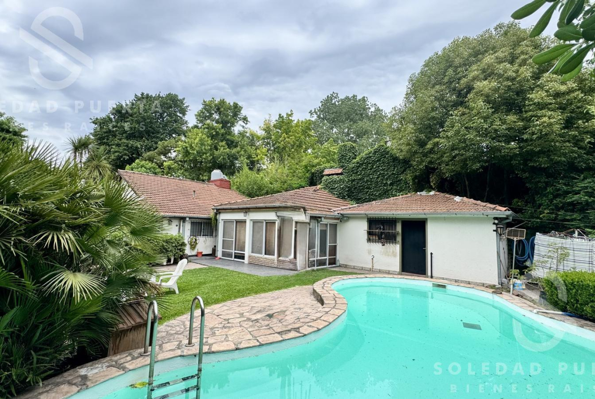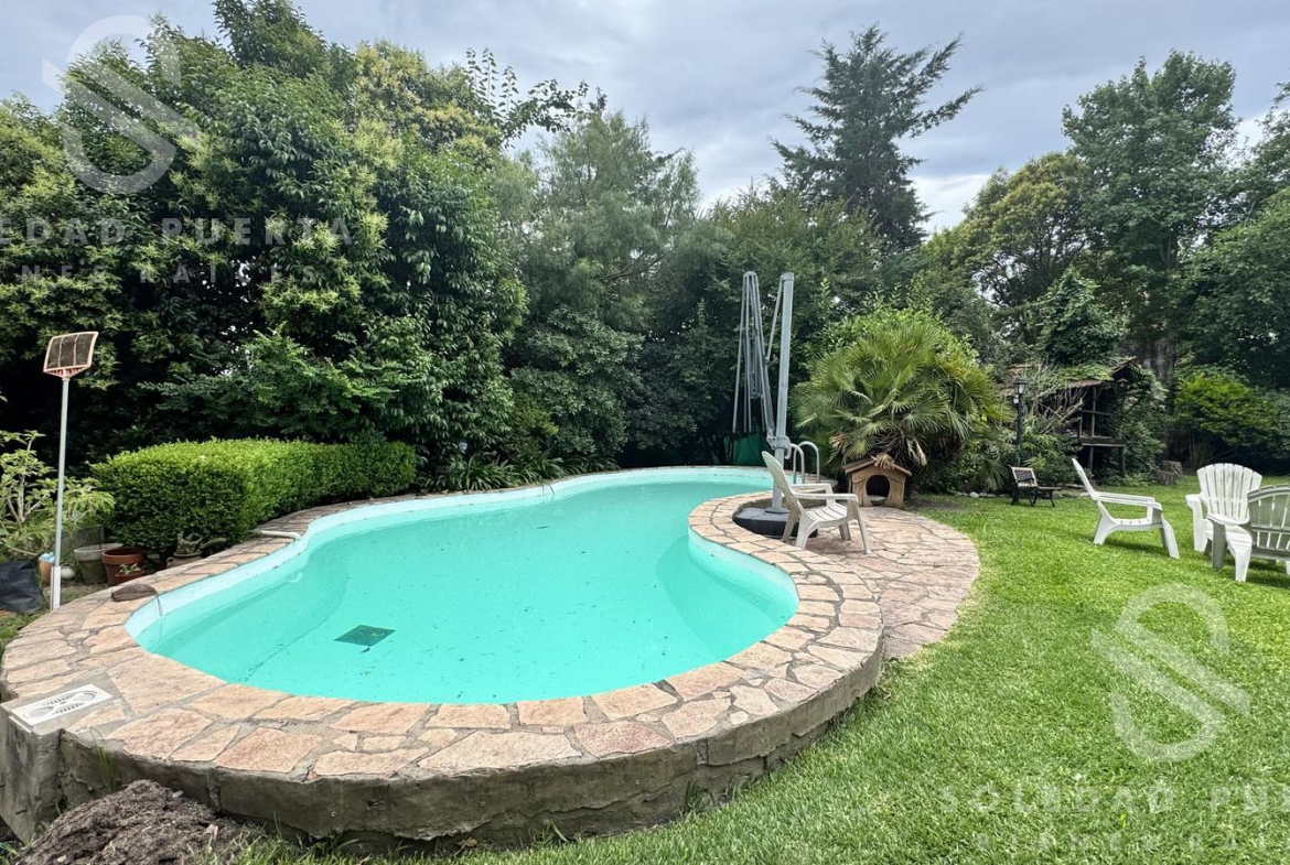 Gran jardín con piscina, lavadero, galpón y cochera techada.